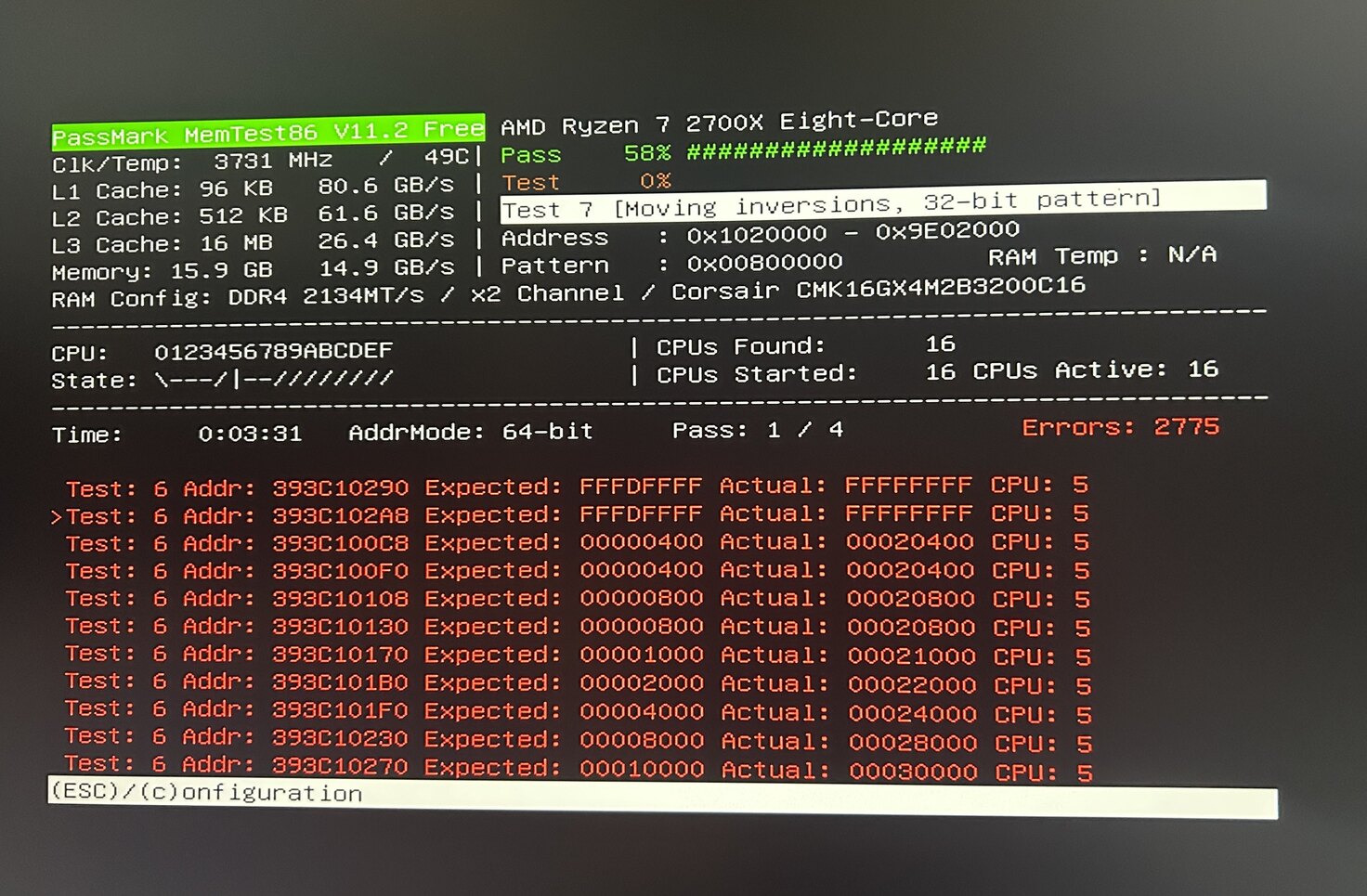 This system is equipped with two 8GB DDR4 modules (Corsair Vengeance LPX) in a 4-slot motherboard, with only two slots populated. I swapped the modules between different slots and re-ran the test—same result, consistent errors right from the start.