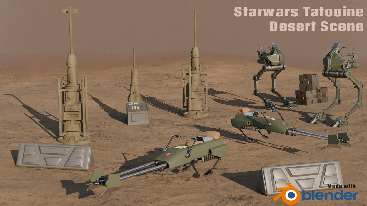 With the Moisture Vaporator model complete and placed in a simple desert setup, I felt the scene had more potential waiting to be unlocked. I wanted to push beyond a static backdrop and evoke the feeling of Tatooine as a harsh, lived-in world—dusty, sunbaked, and full of visual narrative.