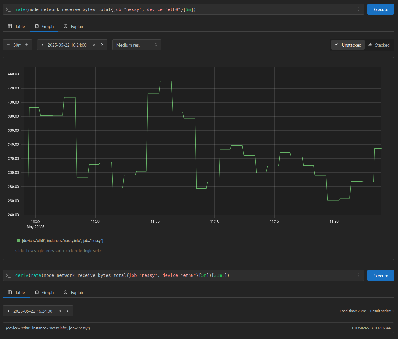 Just like last time, let’s take a few samples from Prometheus for the node_network_receive_bytes_total metric: